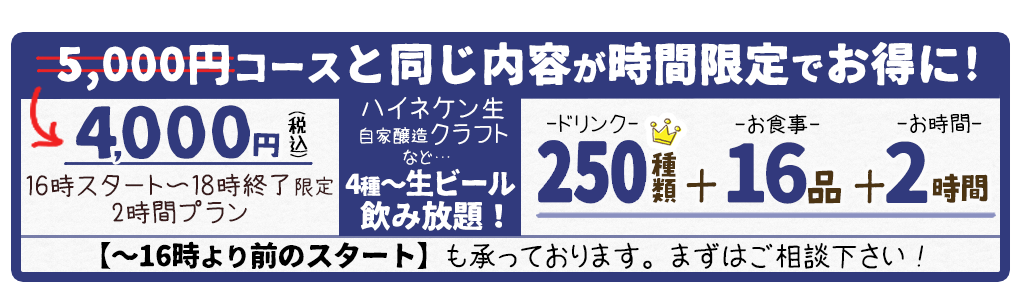 16時〜からご利用の場合、上記と同じ内容で4000円(税込)※時間のみ2時間で楽しめます!「16時スタート・18時終了限定、2時間プラン」とお申し付け下さい♪